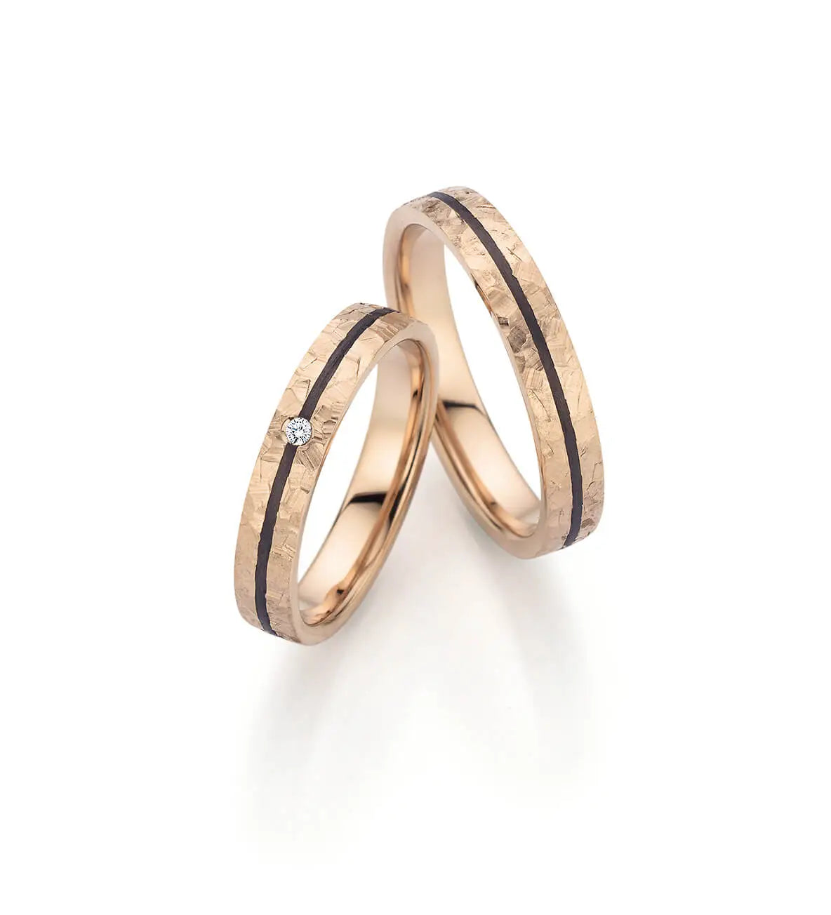 Le modèle « Bonded » allie esthétique délicate et profondeur symbolique. Le chatoiement chaleureux de l'or caramel est ponctué par une bande en fibre de carbone saisissante, symbolisant votre amour tel un lien indestructible. Cette bague exprime l'équilibre entre romantisme délicat et engagement profond, parfaite pour les couples qui souhaitent immortaliser leur amour dans un design unique.