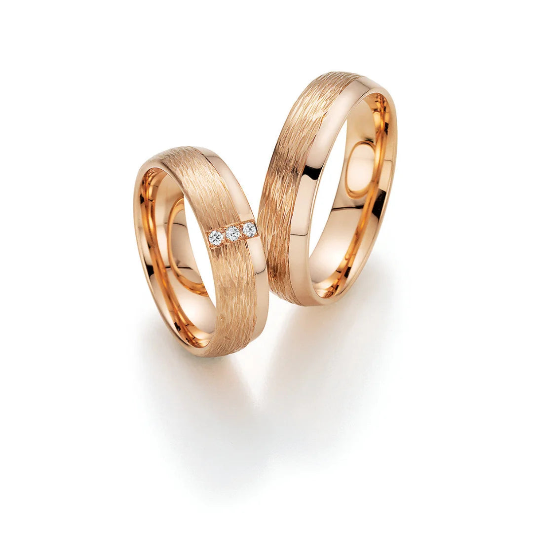 Les diamants sont disposés perpendiculairement au modèle, leur permettant d'être pleinement mis en valeur. Les anneaux présentent une surface texturée « chêne-liège », particulièrement résistante à l'usure, et une surface polie. L'or rose diffuse une lumière intense.