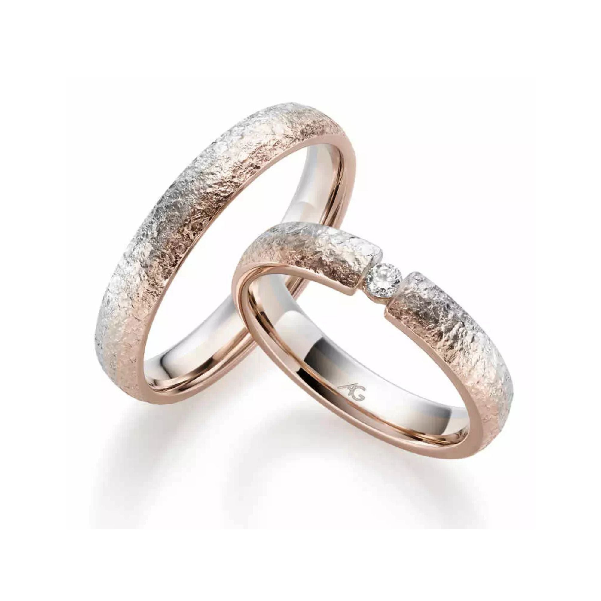 Découvrez la beauté unique des alliances Gerstner au clair de lune multicolore ! Ces alliances multicolores, réalisées en or rouge noisette et blanc 14 carats, brillent d'un diamant taille brillant de 0,06 ct TW/SI. Leur surface mate et martelée leur confère un aspect unique. Leur intérieur arrondi et leur gravure offerte offrent un confort optimal.