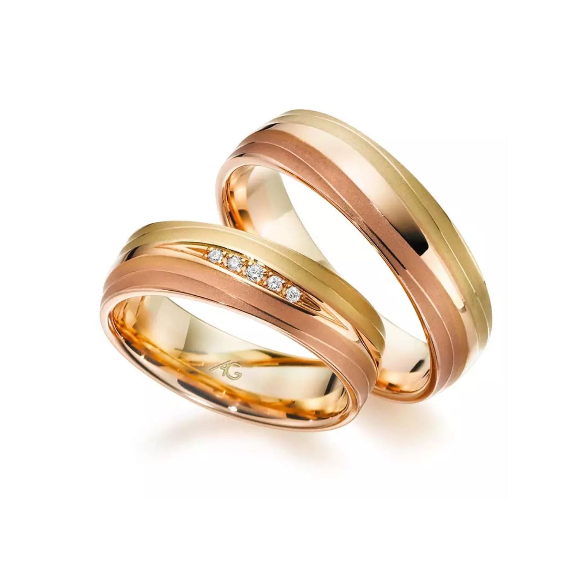 Les alliances multicolores Gerstner Morgenröte constituent une parure unique, agrémentée d'une touche de couleur. L'association de l'or rose 14 carats, de l'or moyen et de l'or jaune leur confère un éclat chaleureux et radieux. Cinq diamants étincelants totalisant 0,028 carat soulignent la beauté de ces alliances. Parfaites pour celles qui recherchent un bijou unique !