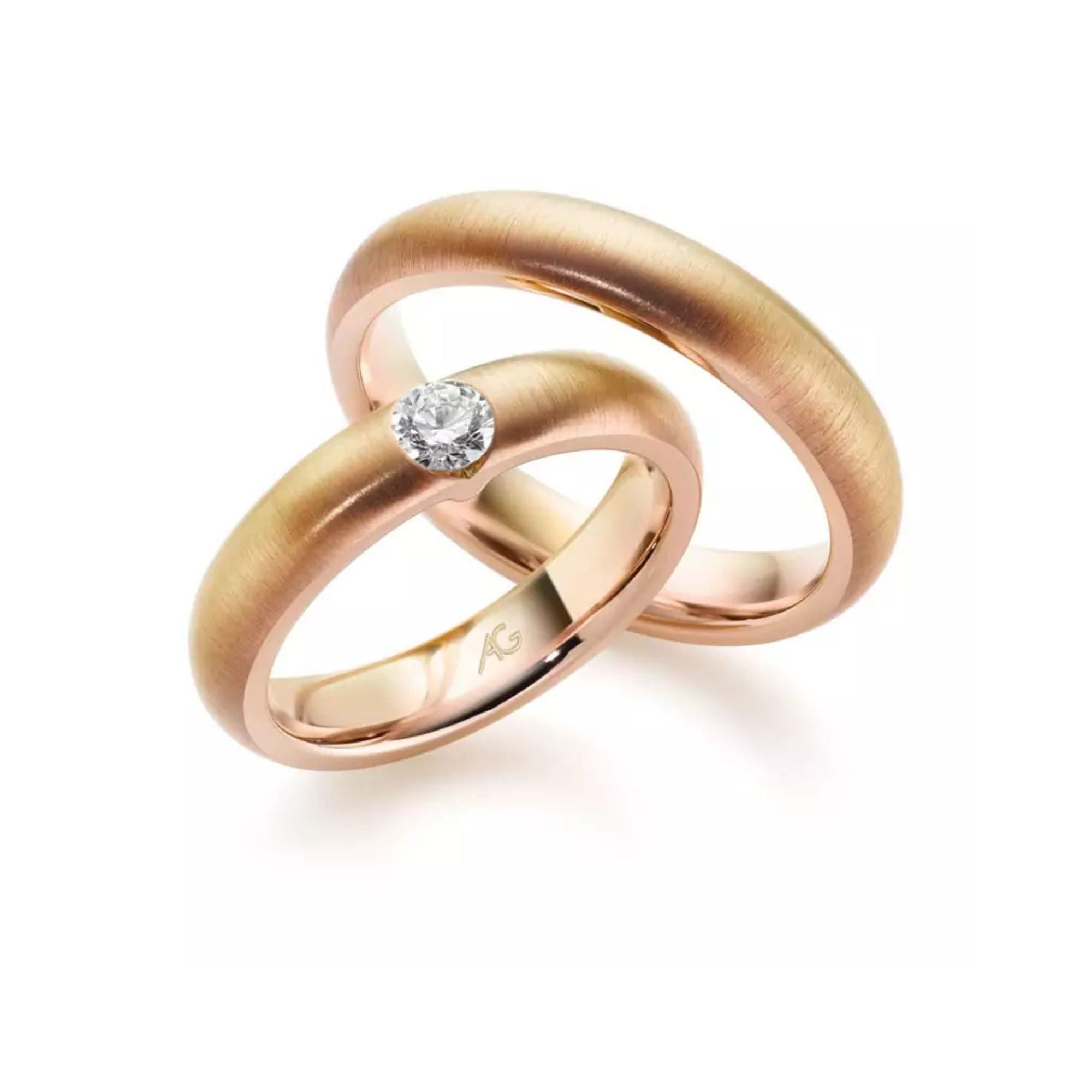 Ajoutez une touche d'éclat à vos vœux de mariage avec les alliances multicolores Gerstner Morgenröte ! L'alliance de l'or rose, moyen et jaune 14 carats est un véritable accroche-regard. Les bagues pour homme et femme mesurent chacune 4,50 mm de large et sont ornées d'un diamant de 0,25 ct. Le compagnon idéal pour une journée inoubliable !