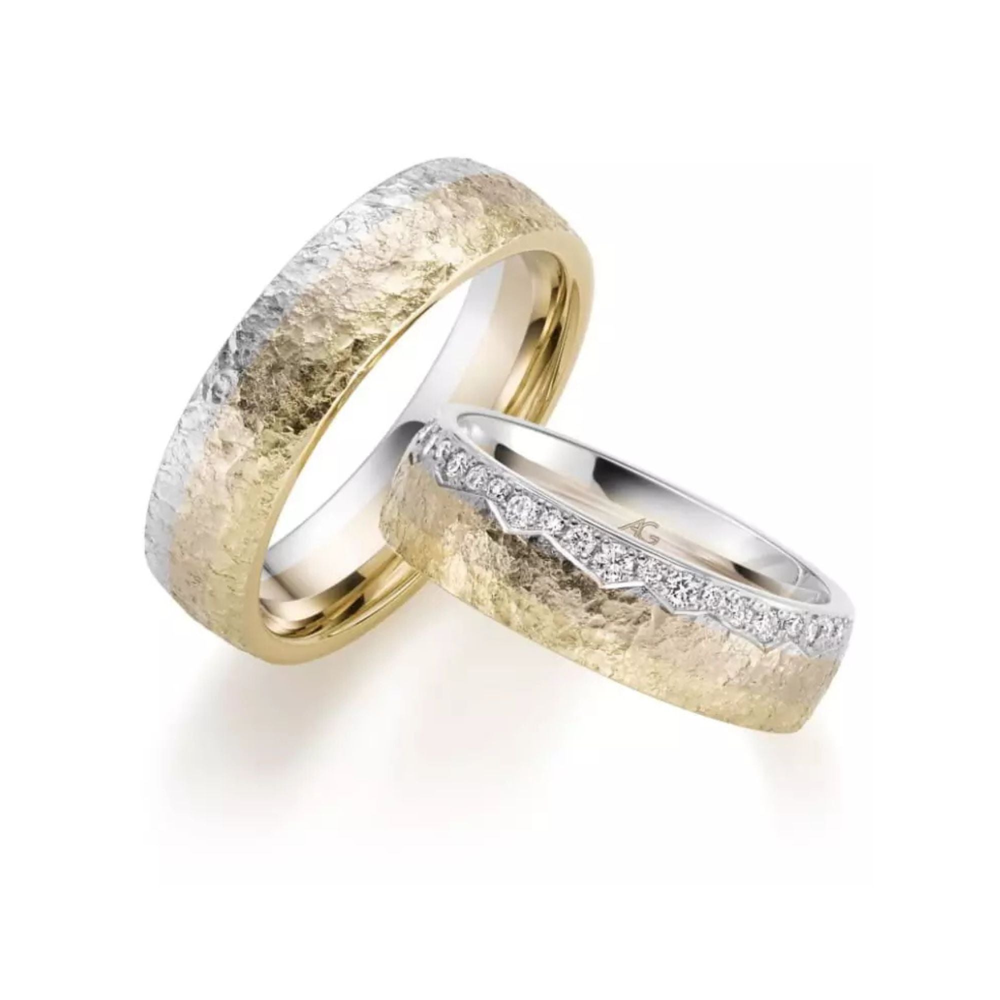 Découvrez la beauté et l'originalité de nos alliances Gerstner sous le soleil scintillant. Le modèle présenté allie or jaune, or blanc et ivoire de la plus haute qualité. Avec ses 22 diamants étincelants totalisant 0,215 ct, cette parure est un véritable accroche-regard. L'alliance pour homme, de 6,00 mm de large, et l'alliance pour femme, de 7,00 mm de large, feront battre le cœur de tous.