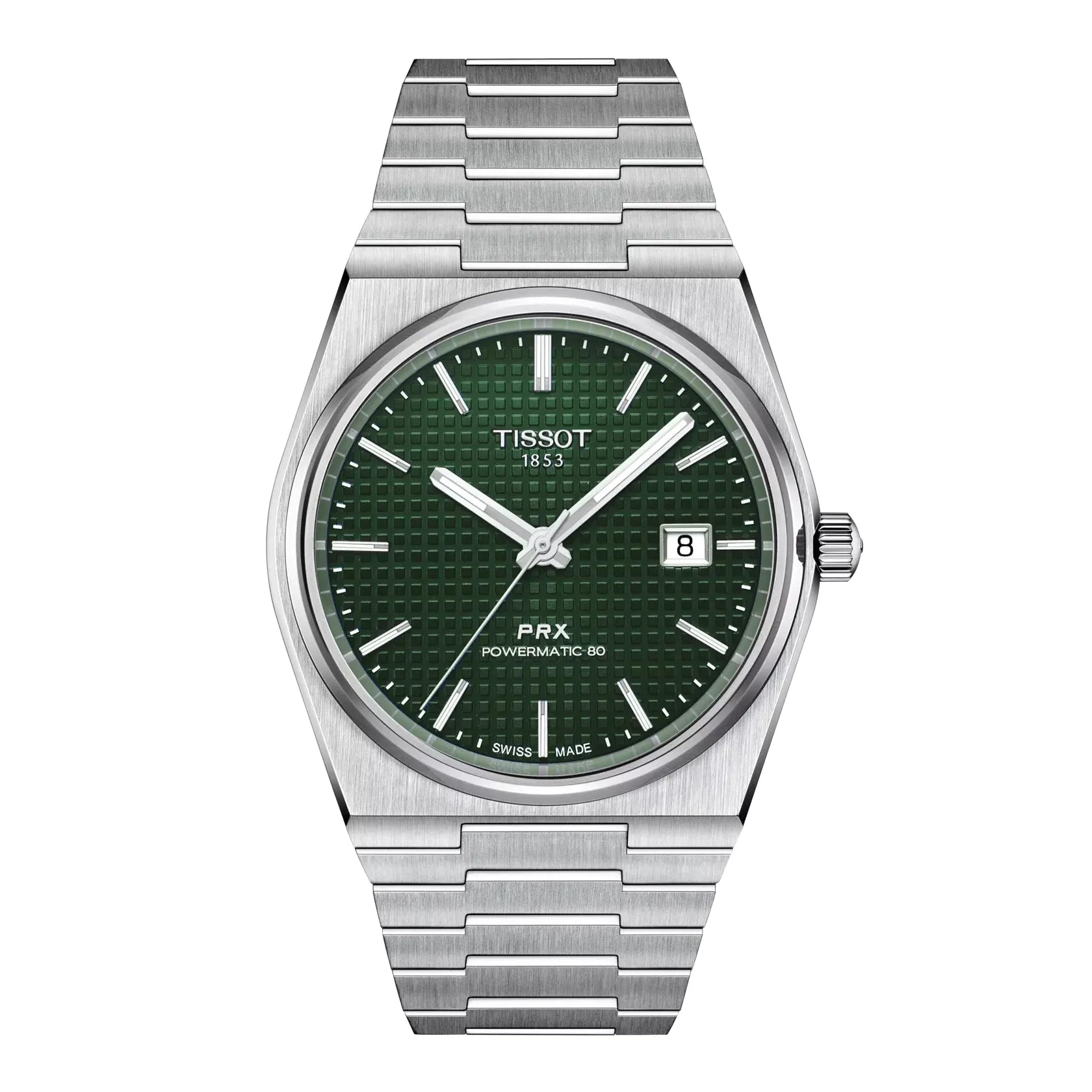La Tissot PRX Powermatic 80 verte est une montre pour homme alliant élégance classique et style sportif. Son boîtier en acier inoxydable de 40 mm et 10,9 mm d'épaisseur abrite le mouvement automatique Powermatic 80, offrant une réserve de marche d'environ 80 heures. Son verre saphir inrayable et son étanchéité à 100 mètres garantissent durabilité et fiabilité. Son bracelet en acier inoxydable argenté avec boucle déployante assure un maintien sûr. Le cadran vert aux aiguilles luminescentes et à la date complète le design. Fabrication suisse garantie 24 mois.