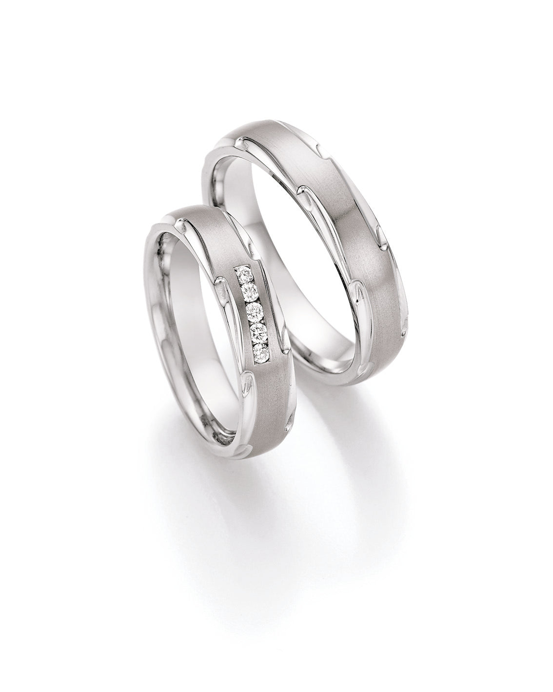 Ces alliances en titane de la collection Ruesch Avantgarde mesurent 5,50 mm de large et 2,0 mm de haut. Élégantes, elles sont disponibles en titane mat et poli, avec cinq pierres serties, un poids en carats de 0,100 et une qualité de pierre W/SI. Idéales pour les couples qui privilégient les styles contemporains et les matériaux durables.