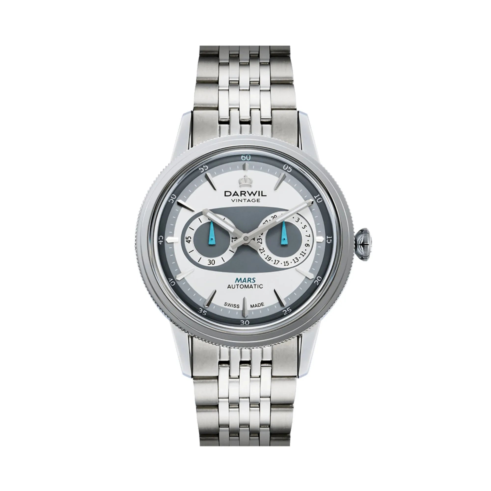 Die Darwil Mars Herrenuhr besticht durch ihr automatisches Kaliber SW295 und ein robustes Edelstahlgehäuse mit 41 mm Durchmesser. Mit 50 m Wasserdichtigkeit und kratzfestem Saphirglas ist sie sowohl alltagstauglich als auch elegant. Das silberfarbene Edelstahlarmband mit Faltschliesse sorgt für sicheren Halt, während das klassische, sportliche Design und das silberne Zifferblatt zeitlose Schweizer Qualität verkörpern.