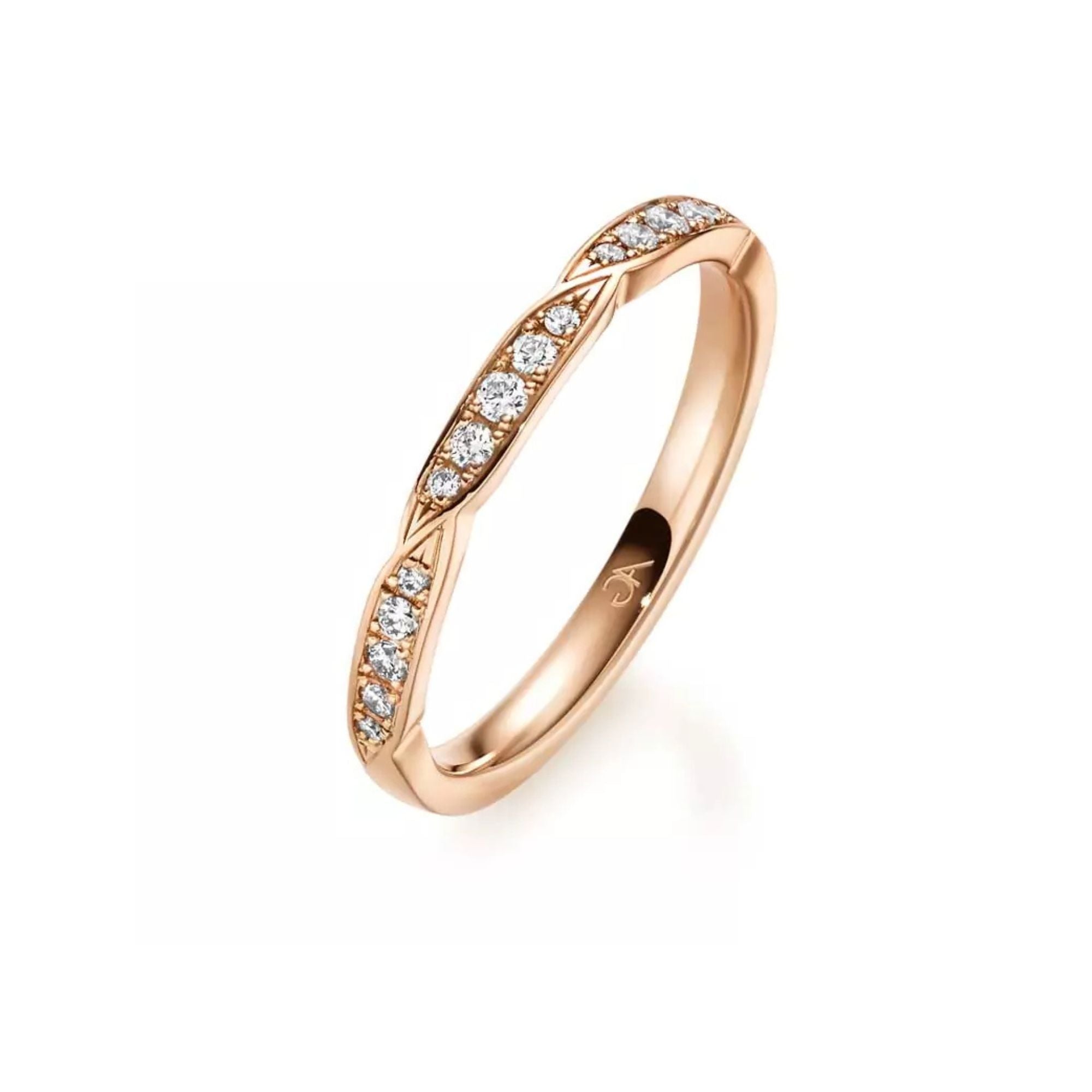 Das präsentierte Modell besteht aus 585 Rotgold, hat eine Breite von 2,30 mm und eine Höhe von 1,7 mm. Es ist mit 15 Brillanten im Gesamtgewicht von 0,135 Karat verziert. Zusätzlich ist es auch in Palladium und Platin erhältlich.