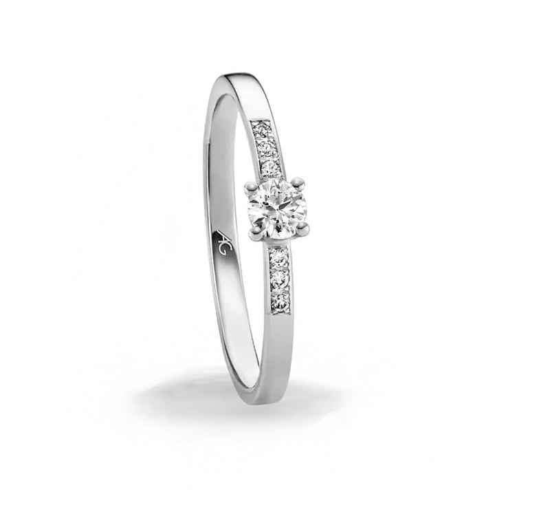 Dieses Modell besteht aus 585 Weissgold mit einer Breite von 1,80 mm und ist mit 7 funkelnden Brillanten im Gesamtgewicht von 0,13 Carat besetzt. Alternativ ist das Design auch in Palladium oder Platin erhältlich.