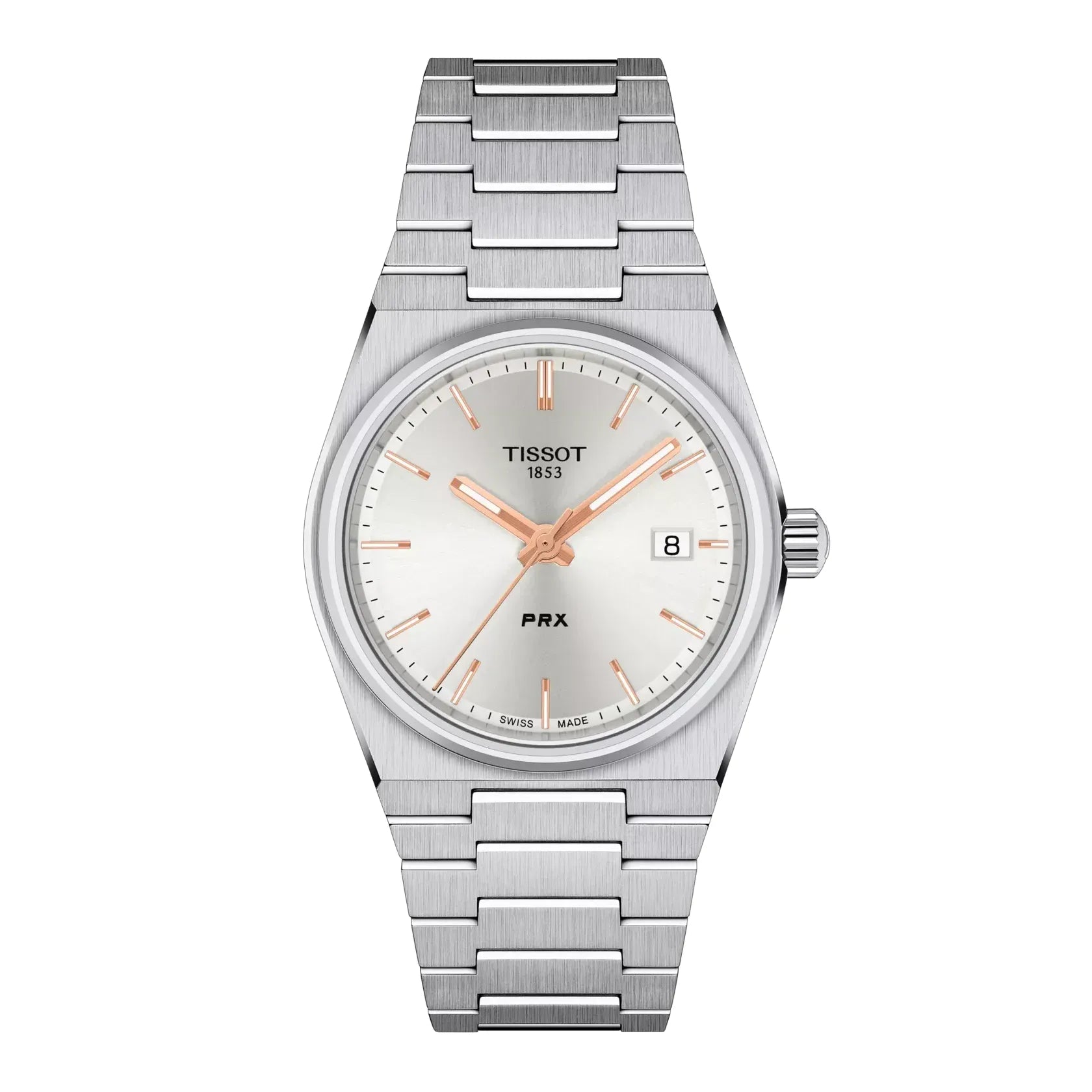 Die Tissot PRX 35 Quartz Silbrig ist eine stilvolle Damenuhr mit einem 35 mm grossen Edelstahlgehäuse und einer Höhe von 9,6 mm. Das silberne Zifferblatt wird von kratzfestem Saphirglas geschützt und verfügt über eine praktische Datumsanzeige sowie leuchtende Zeiger für optimale Ablesbarkeit. Mit einer Wasserdichtigkeit von 100 Metern und einem silberfarbenen Edelstahlarmband mit Faltschliesse verbindet diese Uhr klassische Eleganz mit sportlicher Funktionalität.